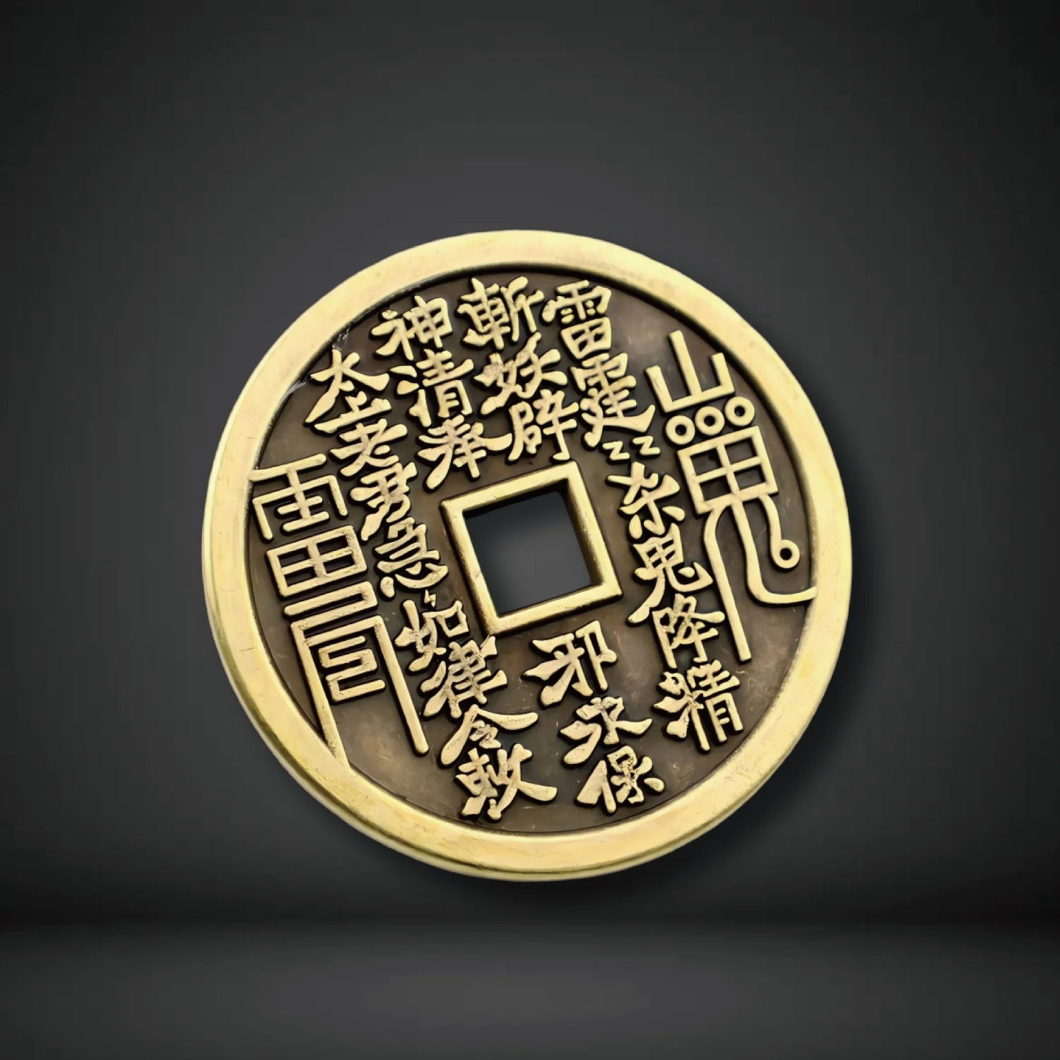 Meticulously replicated from Qing Dynasty originals, this hand-cast bronze Shan Gui Hua Qian displays intricate Bagua symbolism and deliberate black oxidation for antique authenticity. Serving as both a sacred Taoist ritual object and cultural artifact, it embodies centuries-old Chinese folk beliefs in spiritual protection and prosperity attraction. The coin's weighted feel and museum-grade detailing make it a standout piece for metaphysical practitioners, Feng Shui applications, or antique numismatic collections.